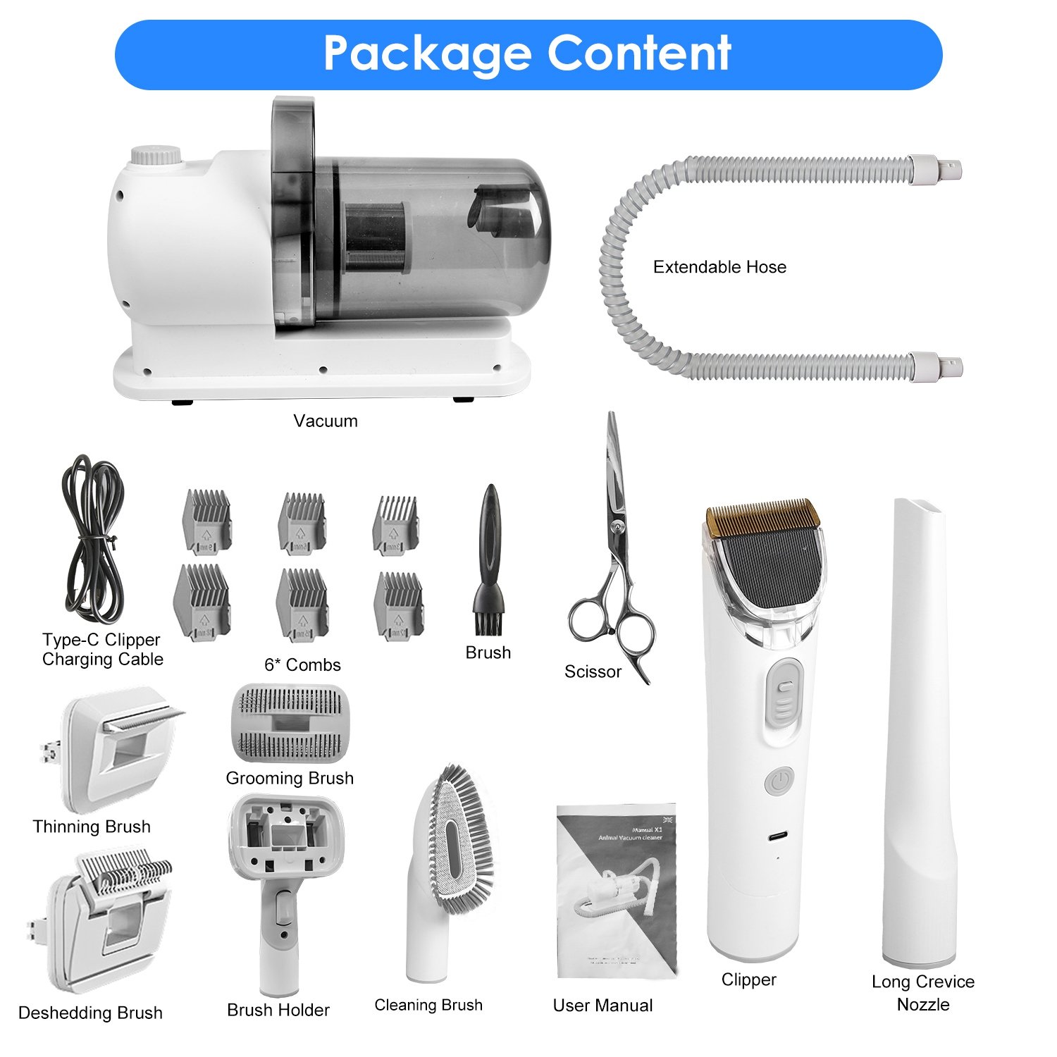 Our professional pet grooming kit includes 7 attachments for comprehensive grooming, this all-in-one solution saves you time and money by providing a salon-like experience at home, reducing your pet\'s stress from unfamiliar environments. With special noise-reduction technology, our vacuum & clipper operates below 65dB to protect pets\' hearing during grooming sessions, preventing them from running away. Its powerful yet quiet motor offers up to 10,000PA suction power, capturing 99% of loose hair in the vacuum cup. Adjust the suction easily with the stepless knob as needed. Large 2.5L dust collector allows for uninterrupted grooming without frequent emptying. Say goodbye to costly pet salon visits and save precious time with our comprehensive pet grooming kit.